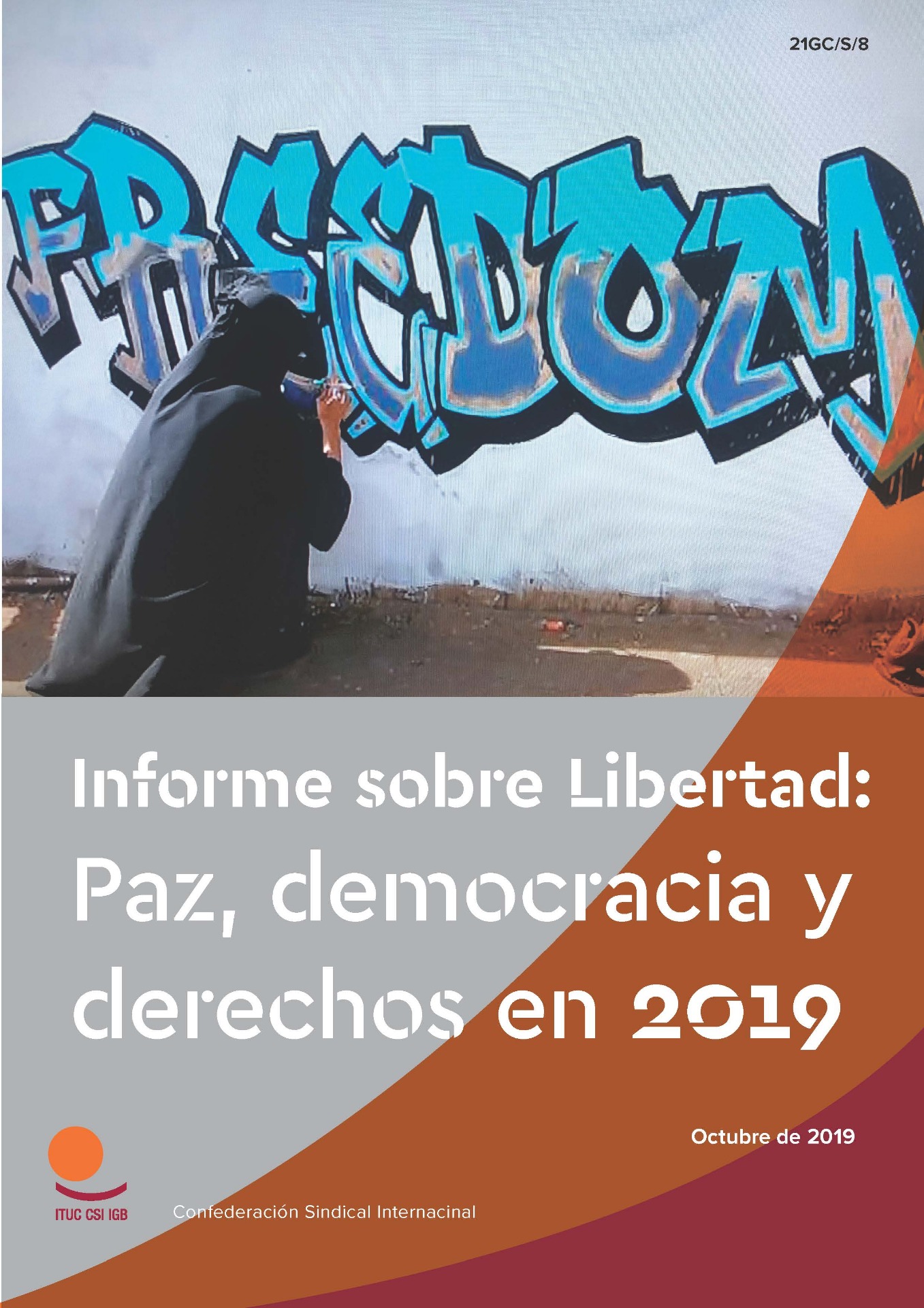 La Confederación Sindical Internacional ha editado un informe sobre libertad, paz, democracia y derechos eligiendo a nueve países o territorios en donde se producen graves quebrantamientos y cuatro temas transversales. Los países elegidos son: Argelia, Argentina, Brasil, Etiopía y Eritrea, Hong Kong, India, Filipinas y Turquía. Los temas elegidos son: La libertad en peligro en 2019; el auge de la derecha; el rearme mundial; Tratados mundiales para controlar las armas nucleares; y el creciente número de personas refugiadas y desplazadas.
